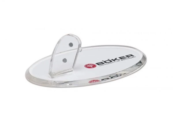Der Acrylmesserständer mit dem Böker-Logo hält das Taschenmesser oder kleines festes Messer mit einem Magneten und die kleine Halternase zuverlässig in einer sehr schönen „Demonstrationsposition“.