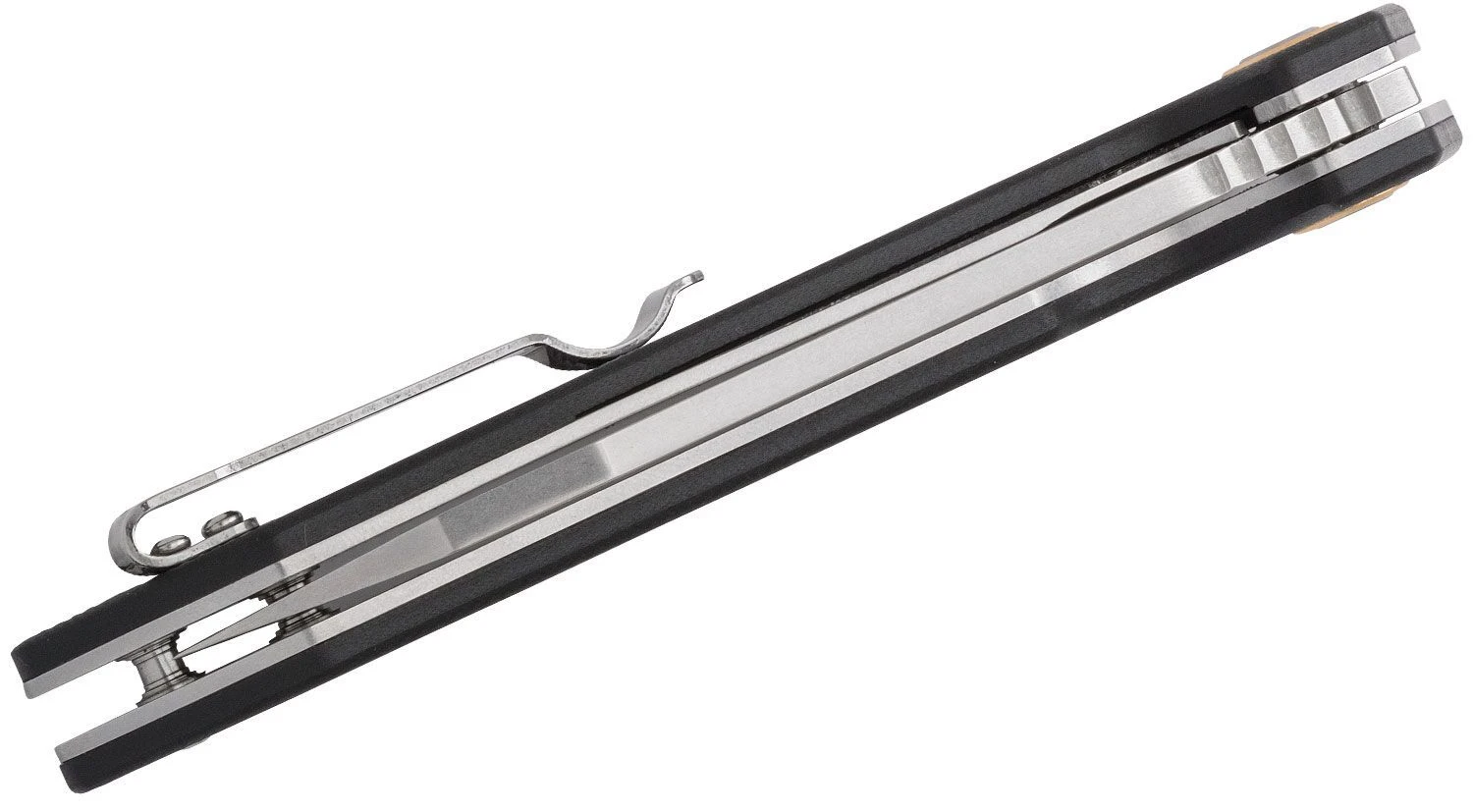 Die aus hochwertigem D2-Stahl gefertigte Klinge lässt sich mit einem Flipper öffnen und wird durch einen Linerlock-Verschluss in der offenen Position gehalten. Der überraschend schlanke Griff ist aus strapazierfähigem G10-Material gefertigt. Am Ende des Griffs befindet sich ein Lanyard-Loch. Das Messer ist mit einem Clip zum Tragen in einer Tasche ausgestattet.