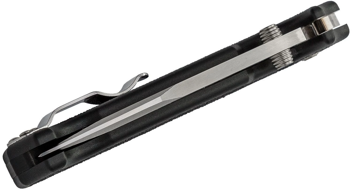 Die Klinge ist aus dem günstigeren rostfreien Stahl 8Cr13MoV gefertigt. Sie lässt sich mit einem Stift an der Klinge öffnen und wird durch eine Tri-Ad-Lock-Verriegelung in der offenen Position gehalten. Für den Griff wurde ein leichtes Griv-Ex-Material anstelle des ursprünglichen G10 verwendet. Am Ende des Griffs befindet sich ein Lanyard-Loch. Das Messer ist mit einem Clip zum Tragen in einer Tasche ausgestattet.
