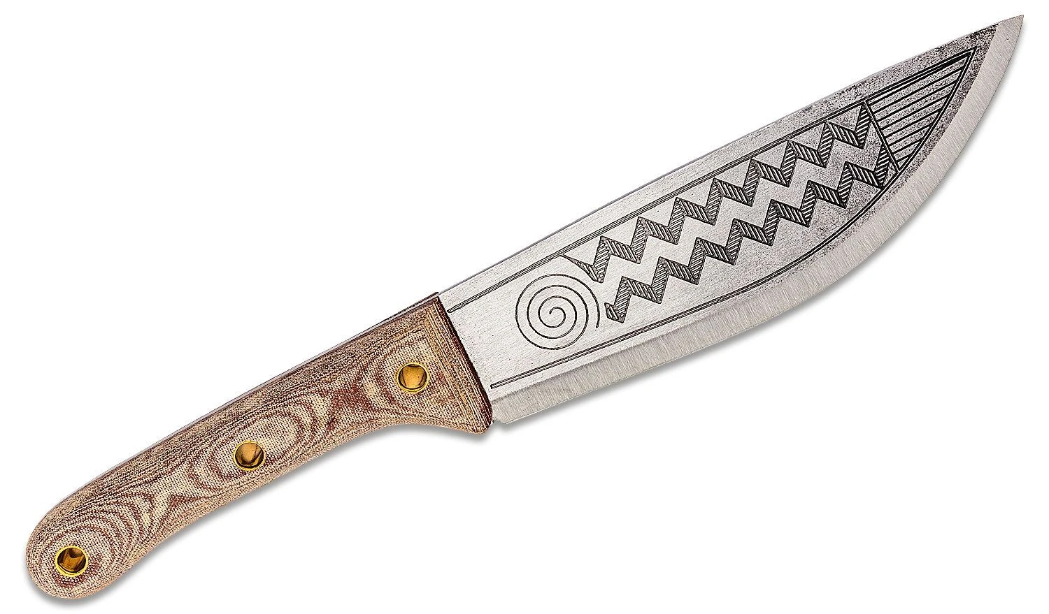 Die Klinge mit Vollerl-Konstruktion ist aus 1075 Kohlenstoffstahl gefertigt. Es ist auf beiden Seiten mit Stammesmustern verziert. Der Griff ist aus strapazierfähigem Mikarta-Material gefertigt. Die Klingen sind durch ein Trio von Messinghohlnieten an der Klinge befestigt.