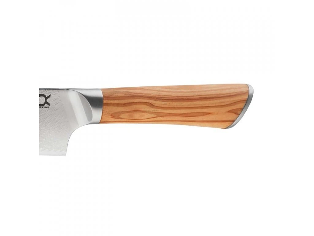 Die Klinge besteht aus einem Kern aus VG10-Stahl mit einer Rockwell-Härte von 62+/-1, der zwischen 66 Lagen Damaststahl aus zwei rostfreien Stählen unterschiedlicher Härte liegt und so eine außergewöhnliche Haltbarkeit und Zähigkeit gewährleistet. Die perfekt ausbalancierte Klinge mit Damastmuster minimiert die Reibung beim Schneiden und verhindert, dass das Schnittgut an der Klinge kleben bleibt. Der runde Griff ist aus lackiertem Olivenholz gefertigt.