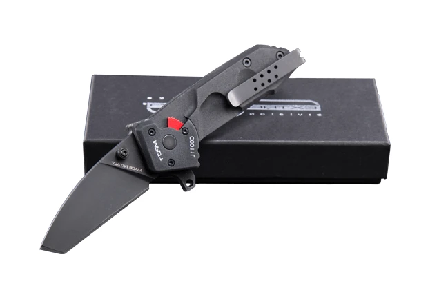 Das taktische und alltägliche (EDC) kleinere Klappmesser Extrema Ratio MF0 T Black hat eine Klinge mit einer glatten Kante vom Typ Tanto in Schwarz mit einem Schwarzoxid-Finish. Es öffnet sich mit einem Flipper oder Daumenstiften und ist mit Linerlock gesichert. Der Griff besteht aus schwarz eloxiertem Aluminium mit einem Glasbrecher. Mit Taschenclip.