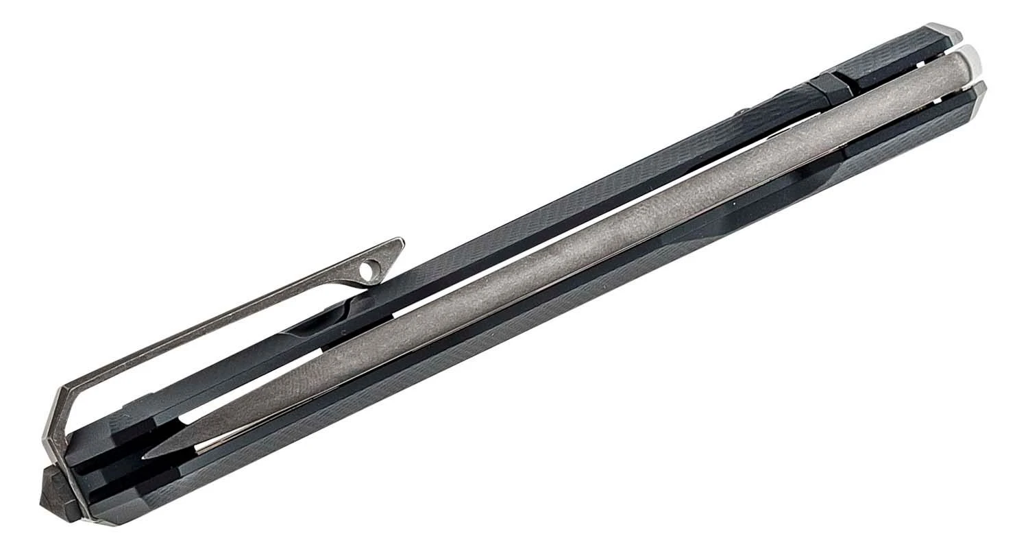 Die Klinge aus hochwertigem M390-Stahl lässt sich mit einem Flipper öffnen und wird durch einen Framelock-Verschluss in geöffneter Position gehalten. Der Griff ist aus anodisiertem Aluminium gefertigt. Am Ende des Griffs befindet sich ein Loch zum Einfädeln eines Schlüsselbands und eine Spitze zum Brechen von Glas. Das Messer ist mit einem Clip zum Tragen in einer Tasche ausgestattet.