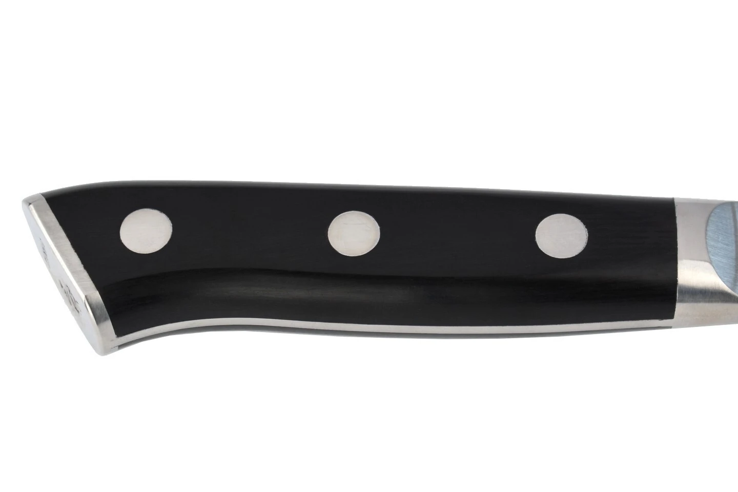 Eine Klinge aus hochwertigem Stahl mit einer Mischung aus Vanadium und Molybdän. Der Griff des Messers ist aus lackiertem Pakkaholz gefertigt.