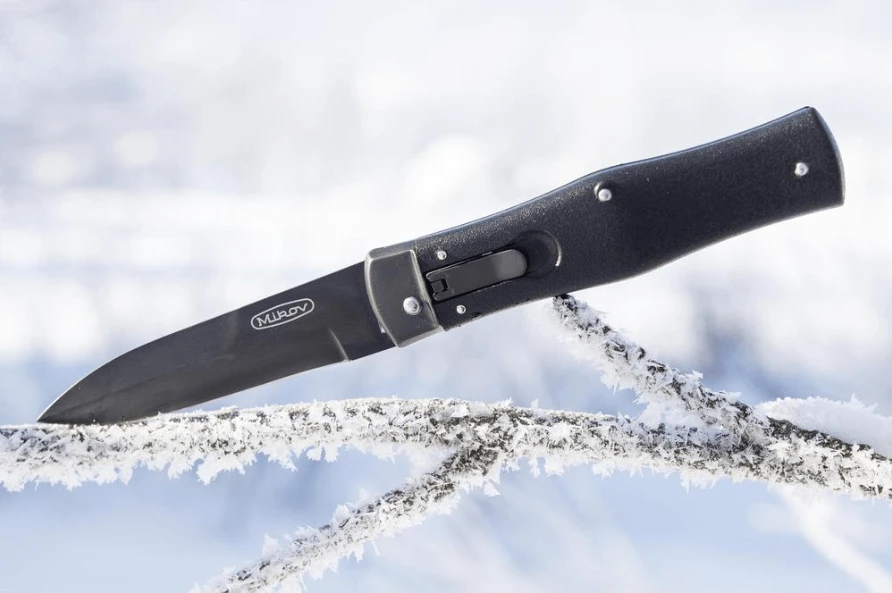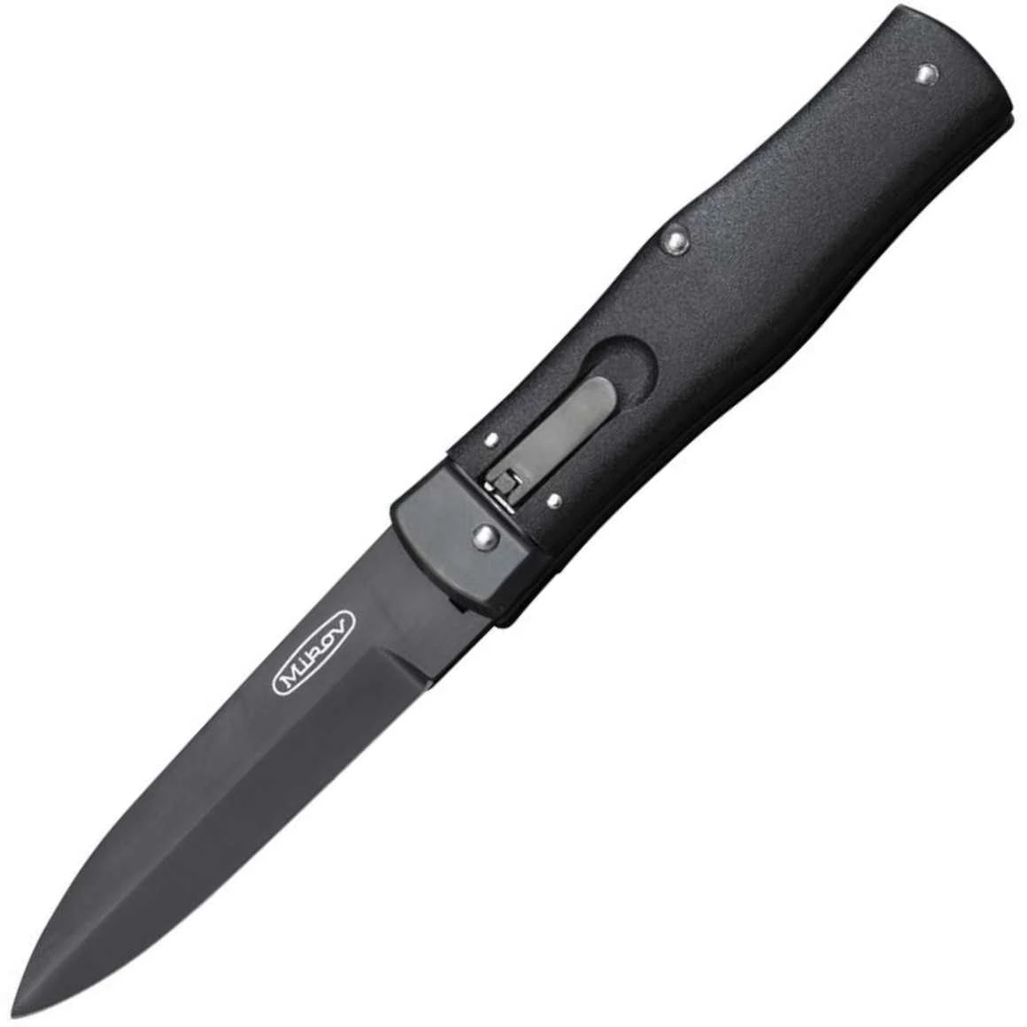 Das komplett schwarze Pop-up-Automatikmesser Mikov 241-BH-1-BKP Blackout verfügt über eine Klinge aus N690-Stahl mit DCL-Oberfläche. Der Griff besteht aus schwarzem Kunststoff. Es öffnet sich mit einer Hand und ist auch für Linkshänder geeignet. Kommt mit einer Ledertasche.