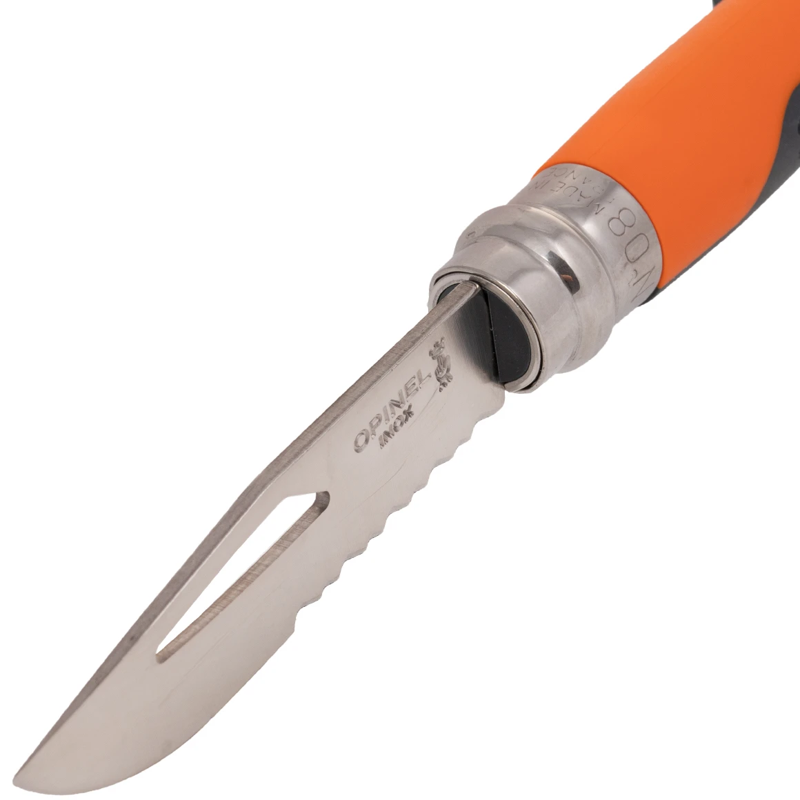 Das Outdoor- Klappmesser Opinel 08 Outdoor Plastic Orange hat eine Klinge mit einer teilweise gezackten Kante aus Edelstahl 12C27 und kann zum Schneiden von synthetischen und natürlichen Seilen verwendet werden. Der Griff besteht aus Glasfaserpolymer in orange-schwarzer Farbe mit integriertem Schäkelöffner und Notfallpfeife. Unten ist eine Schnur zum Aufhängen.