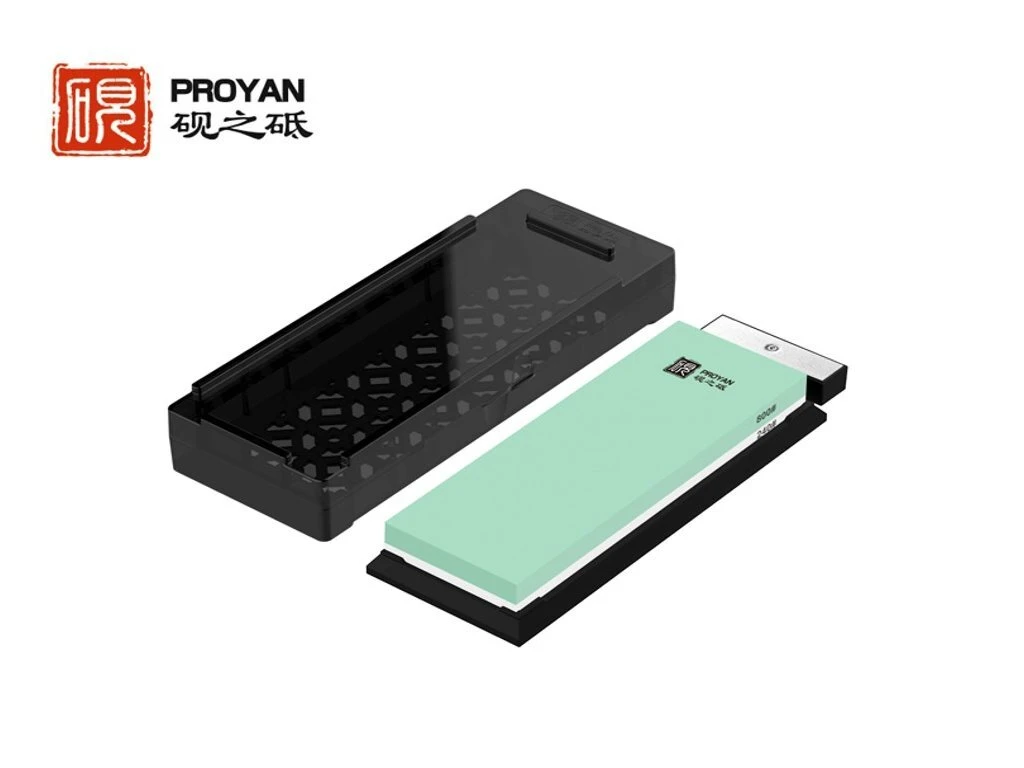 Kombinationsschleifstein mit Steinen der Körnung 240 und 800, einem Nivellierstein und einem Steinständer aus Gummi mit rutschfesten Füßen. Die Steine sollten vor dem Schleifen mit Wasser angefeuchtet werden.