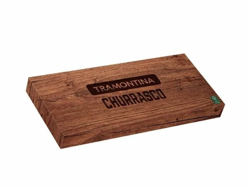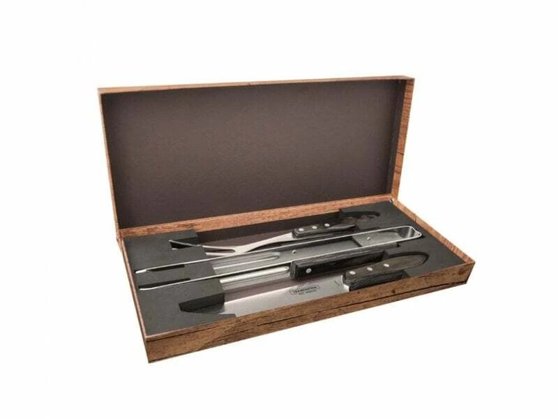 3-teiliges Servierset Tramontina 29899/265 Churrasco for BBQ in braun zum Servieren von Grillspezialitäten. Beinhaltet Messer, Gabel und Zange.