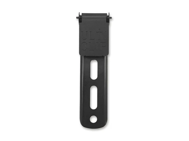 Der Ulticlip wird verwendet, um Messeretui, Waffenholster und andere Ausrüstungsgegenstände sicher am Gürtel oder am Saum einer Hosentasche zu tragen. Hergestellt aus rostfreiem Stahl in schwarz.