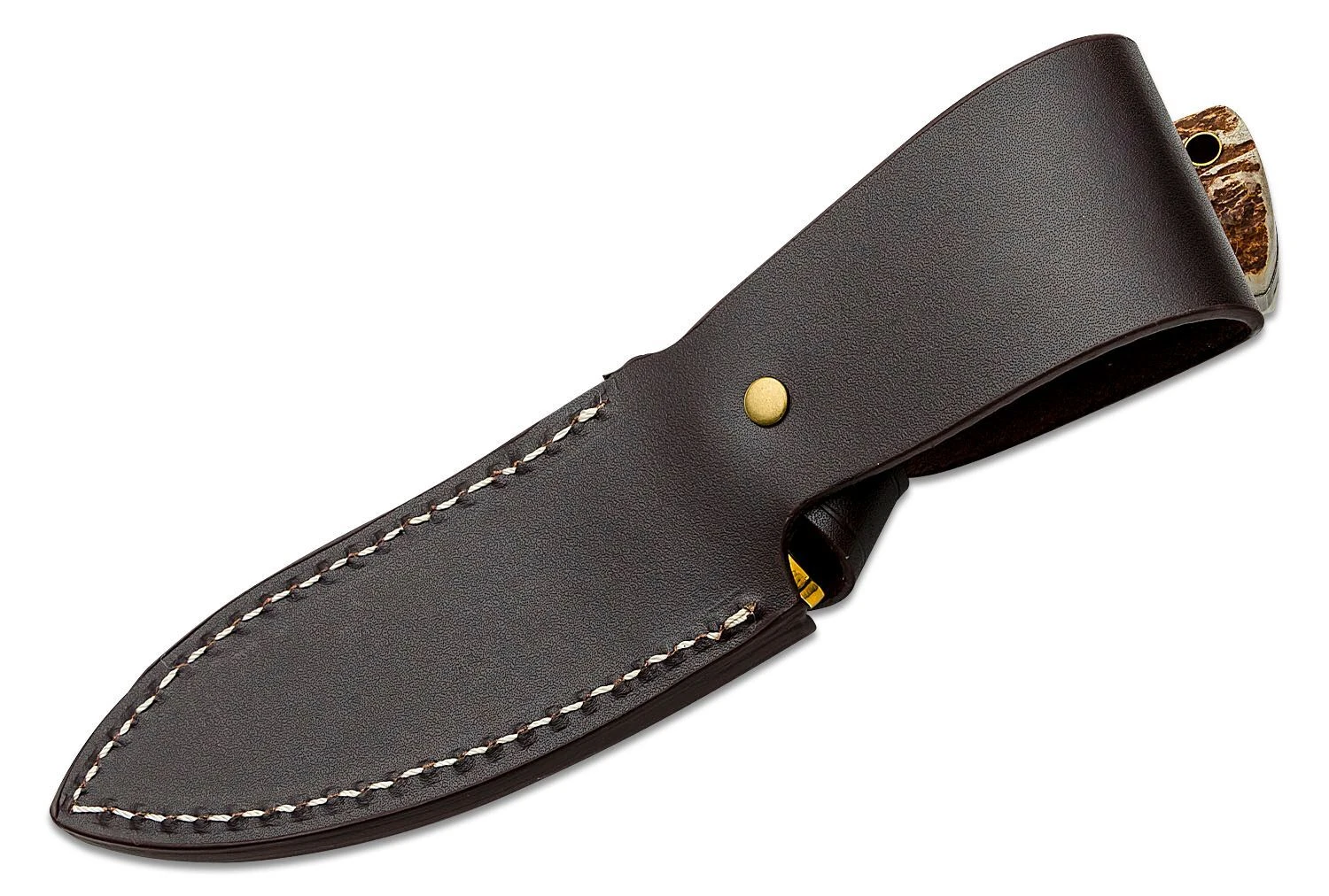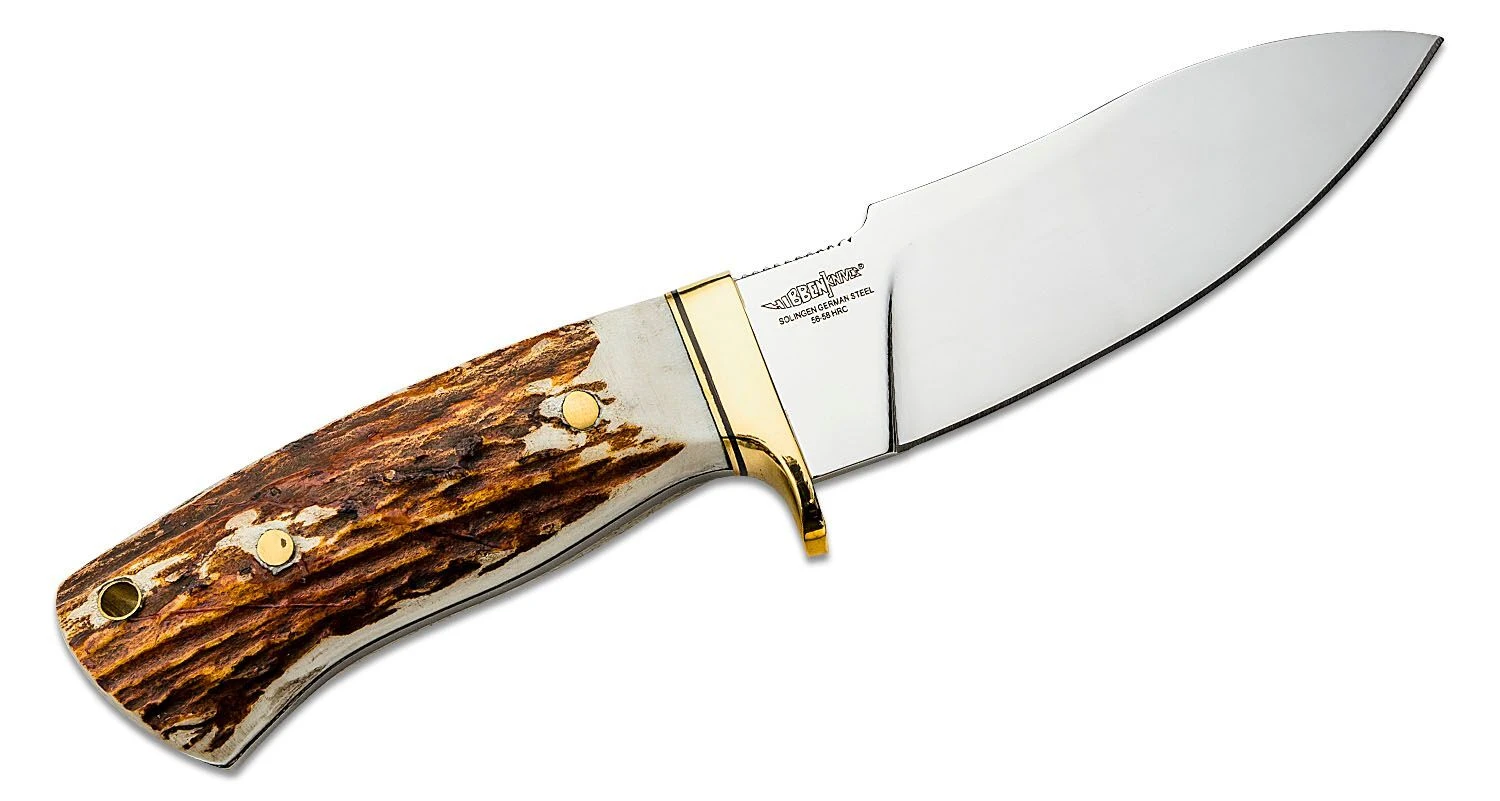 Die polierte Klinge ist aus deutschem 1.4116er Stahl gefertigt. Dieser erstklassige rostfreie Stahl hat eine Härte von 56-58 HRC und eine Schärfe, die weit über die üblicher rostfreier Stähle hinausgeht – ideal für ein Messer, das zum Häuten von Wild entwickelt wurde. Der Griff aus Hirschgeweih ist durch Messingstifte mit der Klinge verbunden. Die Parierstange ist aus poliertem Messing, das mit der Zeit und bei wiederholtem Gebrauch eine schöne Patina entwickelt. Am Ende des Griffs befindet sich ein Loch für ein Schlüsselband.