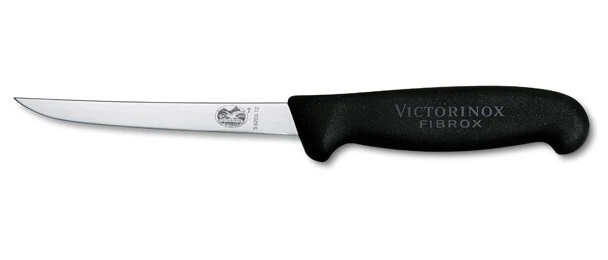 Das Victorinox-Ausbeinmesser mit einer glattkantigen Klinge aus Edelstahl mit einer Länge von 15 cm, geeignet zum Schneiden von Fleisch um Sehnen und Knochen sowie zum Entbeinen von Geflügel oder Schinken. Der Griff besteht aus schwarzem Fibrox-Kunststoff (Victorinox-Erfindung) mit einem Schutzschild. Alle Fibrox-Griffe entsprechen den Anforderungen der Verordnung (EG) Nr. 1935/2004.