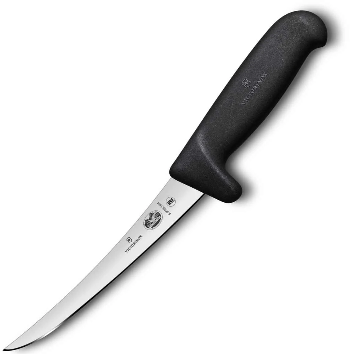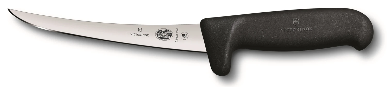 Das Victorinox Safety Grip-Ausbeinmesser mit feststehenden, sich verjüngender Klinge zum Schneiden von Fleisch um Sehnen und Knochen und zum Entbeinen von Geflügel und Schinken geeignet. Edelstahlklinge mit einer Länge von 15 cm, mit einer glatten Kante. Der Griff besteht aus schwarzem Fibrox-Kunststoff (Victorinox-Erfindung) mit einer einseitigen Schutzhülle. Alle Fibrox-Griffe entsprechen den Anforderungen der Verordnung (EG) Nr. 1935/2004.