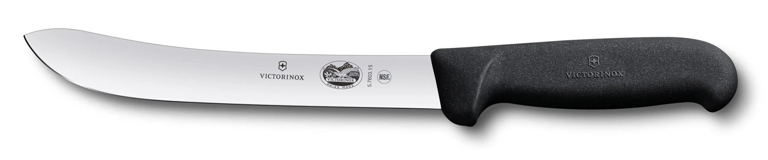 Das Victorinox Metzgermesser mit feststehenden Klinge mit einer glatten Kante aus Edelstahl mit einer Länge von 15 cm und einem Griff aus schwarzem Fibrox-Kunststoff (Victorinox-Erfindung). Alle Fibrox-Griffe entsprechen den Anforderungen der Verordnung (EG) Nr. 1935/2004.