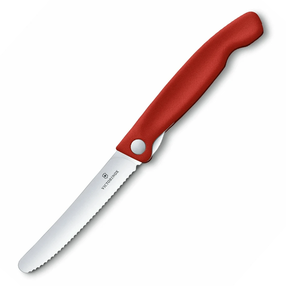 Mit einer robusten 11 cm langen Klinge aus rostfreiem Stahl mit Wellenschliff, die in einen roten Polypropylen-Griff mit Verriegelungsmechanismus eingeklappt werden kann.