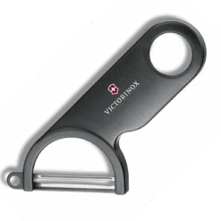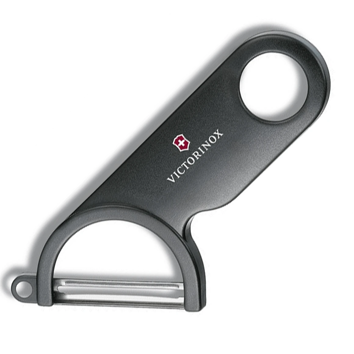 Gebogener Victorinox-Kartoffelschäler mit schwarzem Kunststoffgriff und Loch zum Aufhängen.