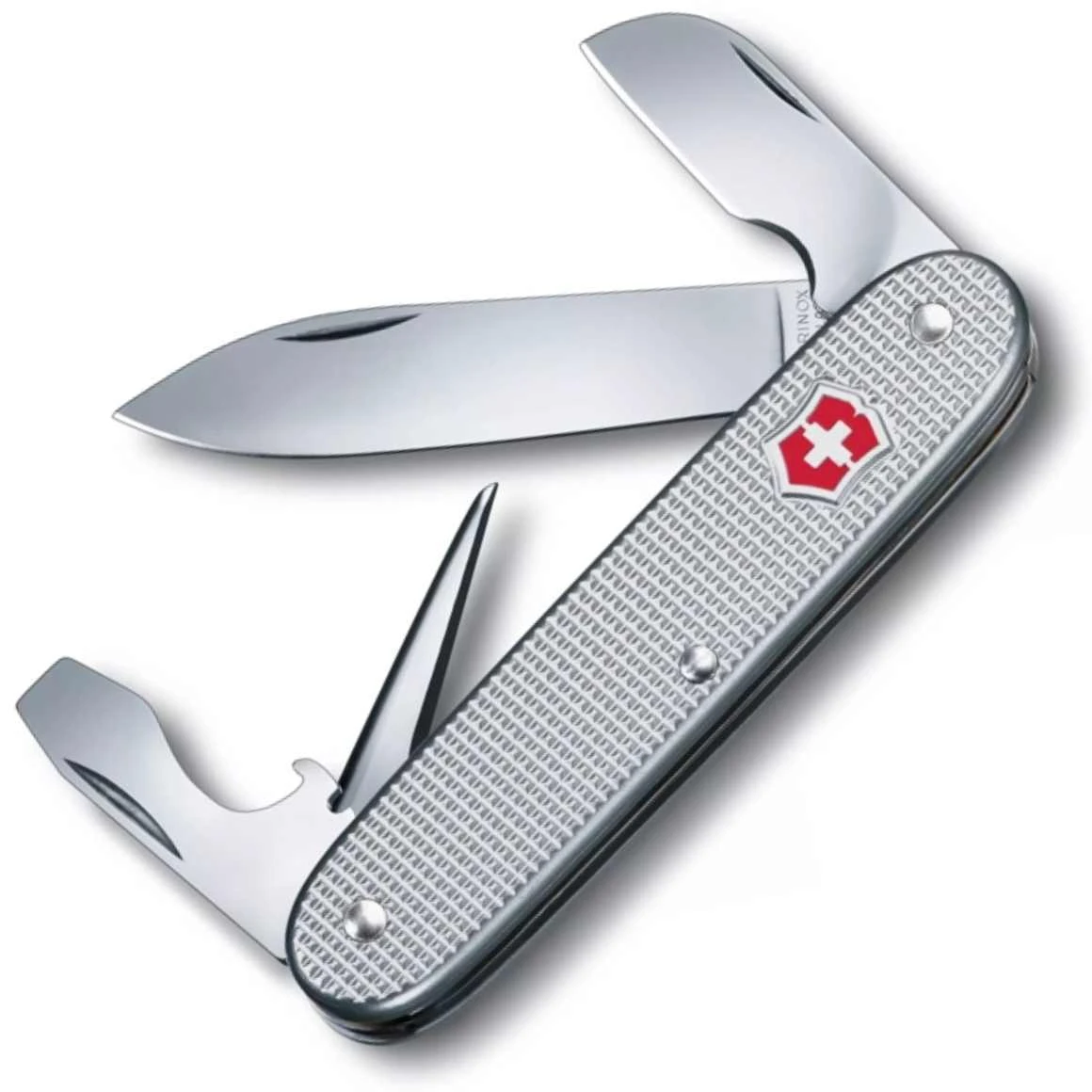 Ein kleines Schweizer Taschenmesser mit einem silbernen Aluminiumgriff.