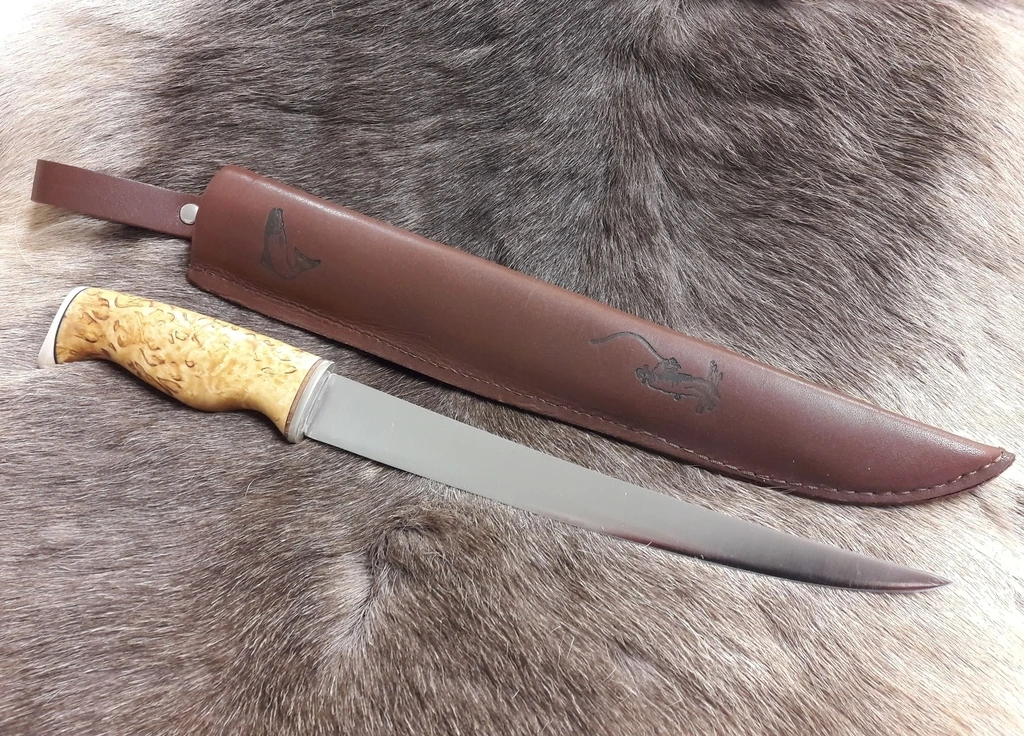 Das Filetiermesser mit Klinge ist ein unschätzbares Werkzeug für jeden begeisterten Angler. Die 22 cm lange Klinge ist aus rostfreiem Stahl gefertigt. Auf dem Griff ist Messing Lockenbirke mit typischen Holzmaserung und Geweih verwendet.