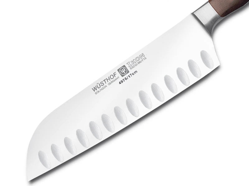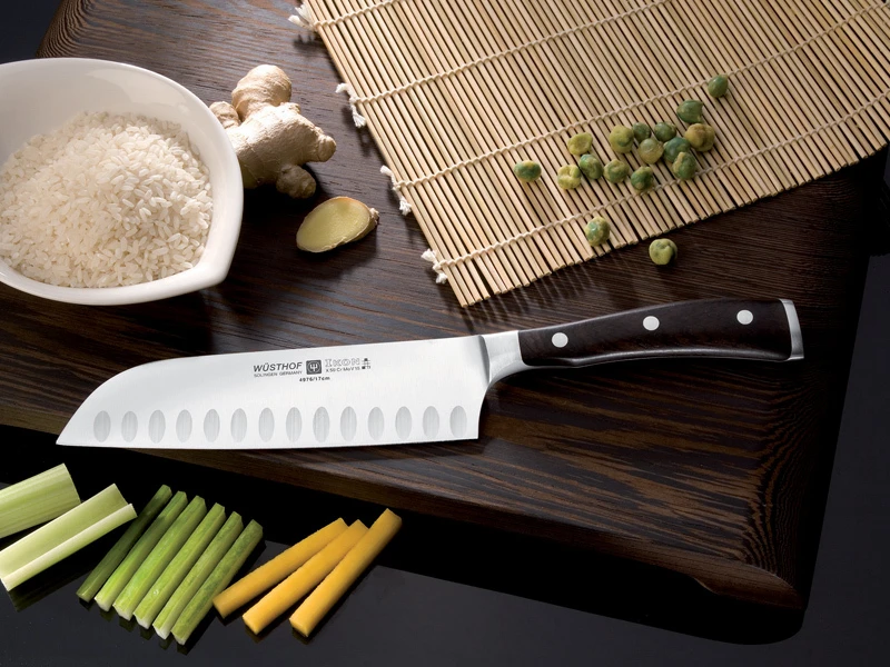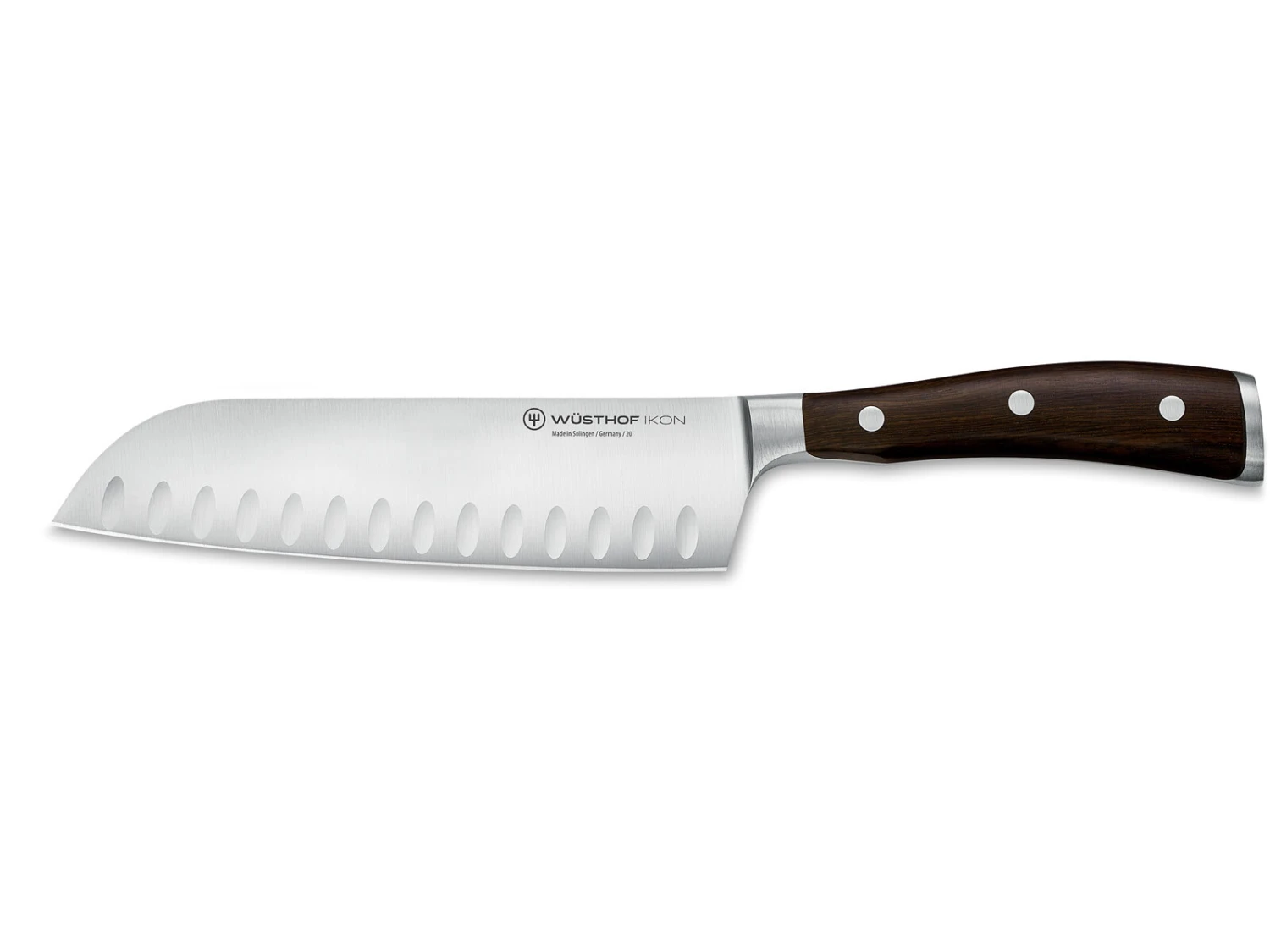 Das japanische Santoku-Messer Ikon ist vielseitig einsetzbar und eignet sich für feinstes Schneiden und Hacken auf der Arbeitsfläche, sowohl für die asiatische als auch für die westliche Küche.